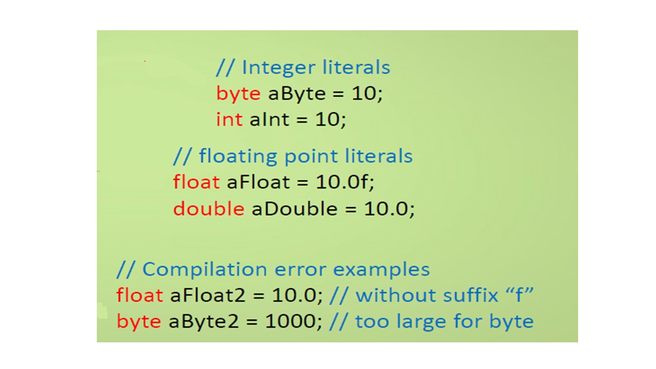 Заметьте, что для переменной aFloat значение установлено 10.0f с суффиксом f после 10.0 – это потому, что литерал с плавающей запятой 10.0 представлен как double – с размером 64 bit, в то время как float имеет размер 32 bit.