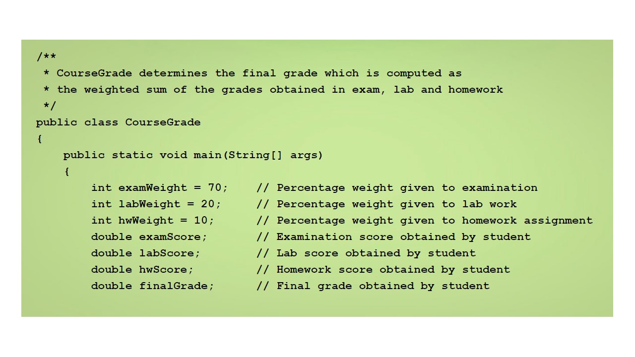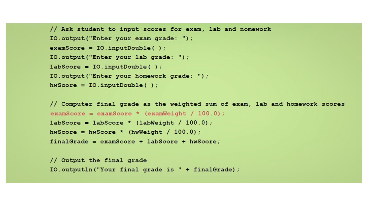 Примером арифметического выражения может служить вычисление окончательной оценки как взвешенной суммы оценок, как мы видели в программе СourseGrade.