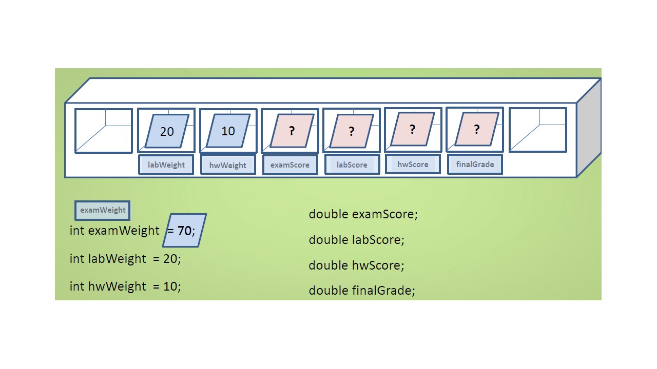 Вы можете видеть, что значения весов определены при инициализации, и examScore, labScore и hwScore, все получили значение 100,0.