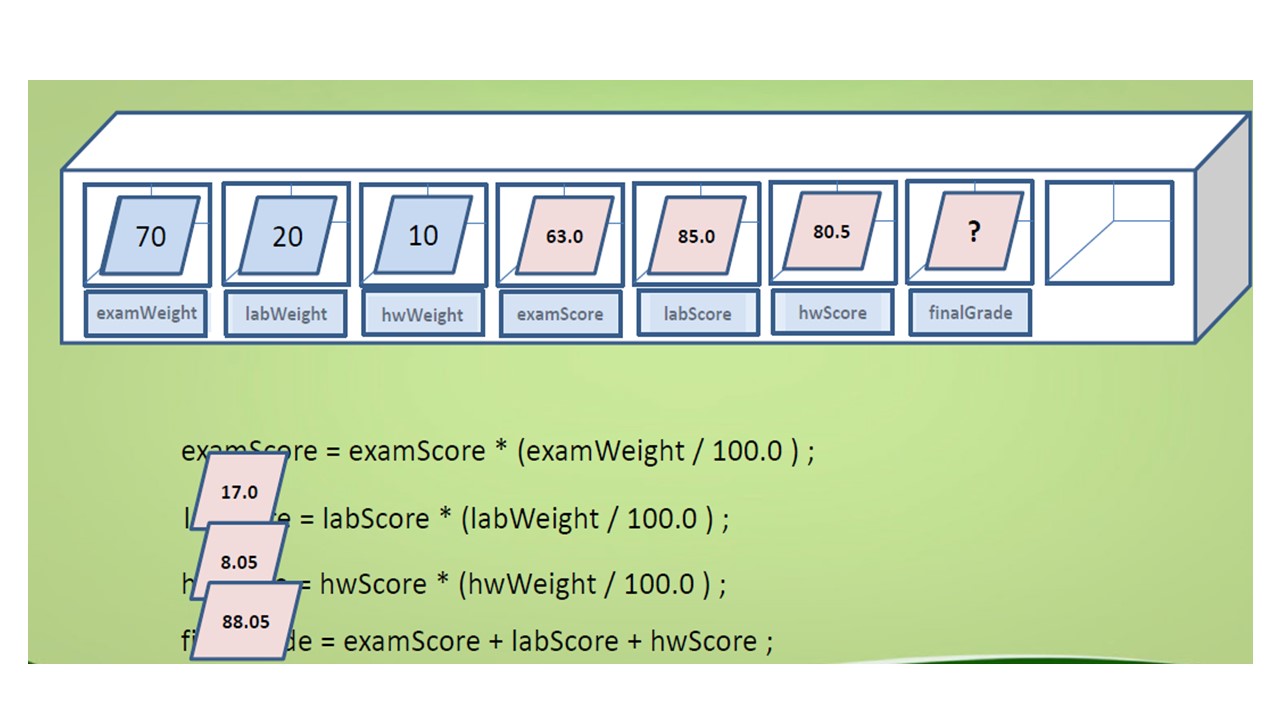 Полученное значение 88,05 затем будет присвоено участку памяти для finalGrade.