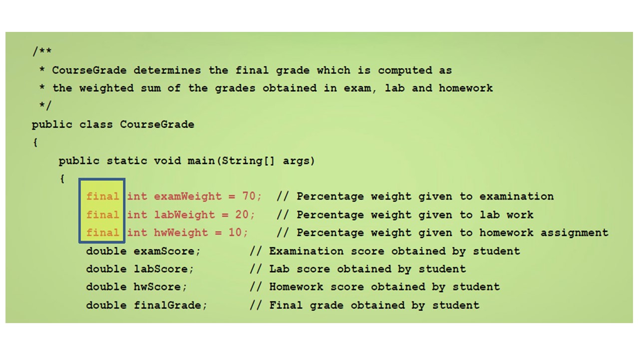 Если мы хотим предотвратить случайное изменение весов, мы объявим эти идентификаторы как константы, поставив final в качестве ключевого слова в начале объявления.