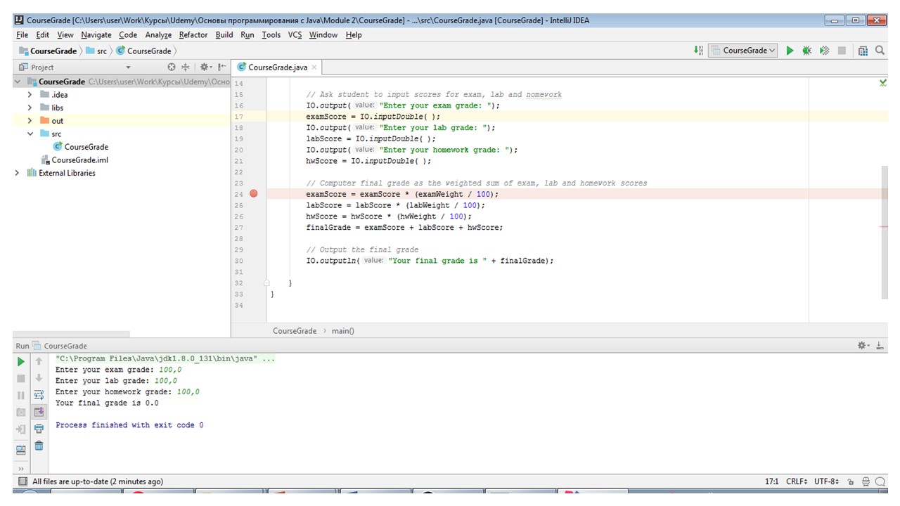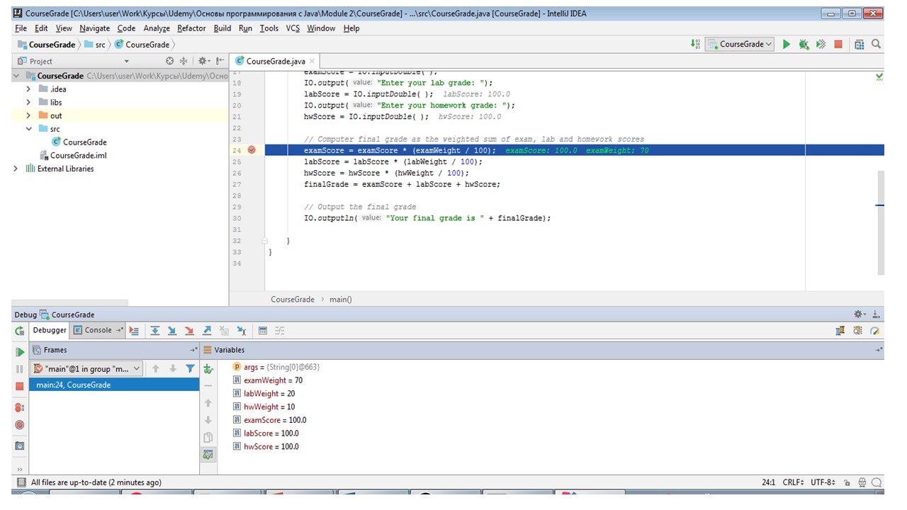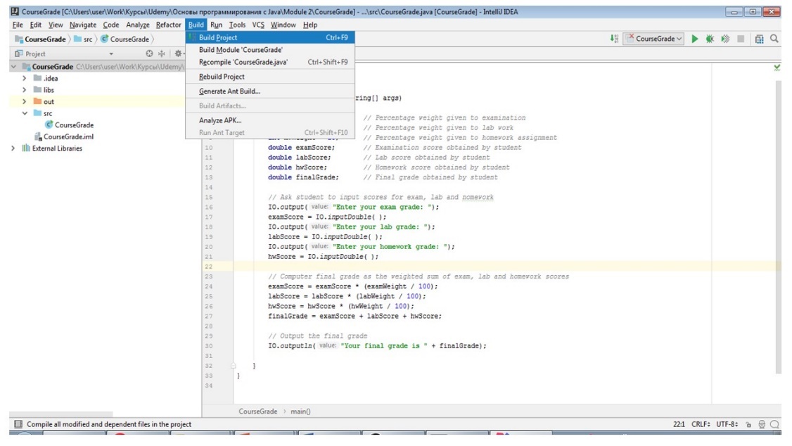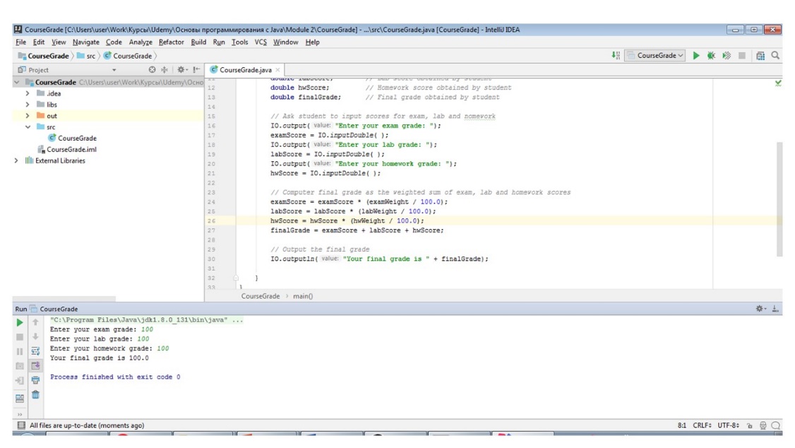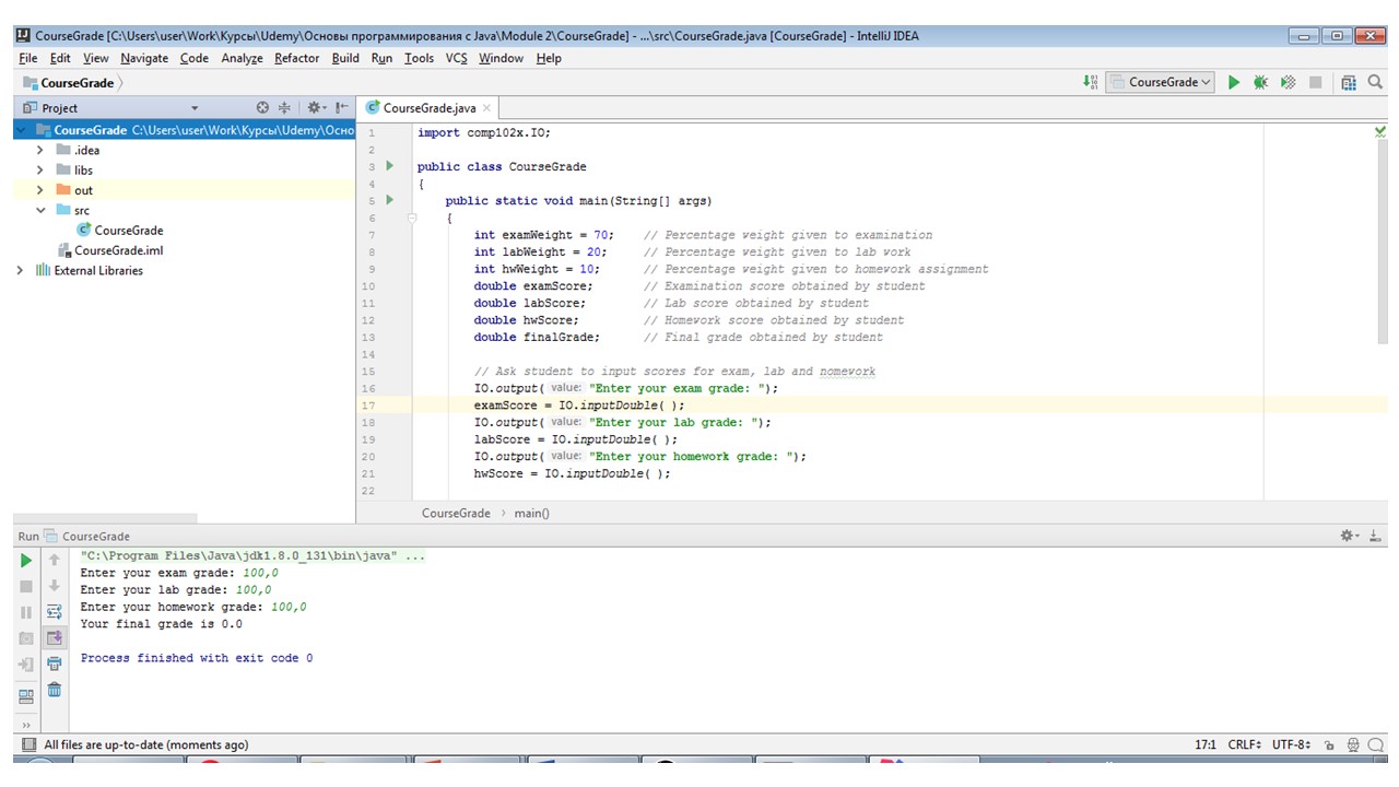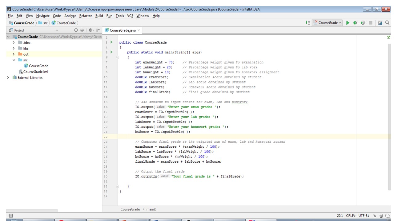 Давайте теперь посмотрим на программу в среде IntelliJ IDEA. Мы откроем проект под названием CourseGrade, который является программой, которую мы только что обсуждали.