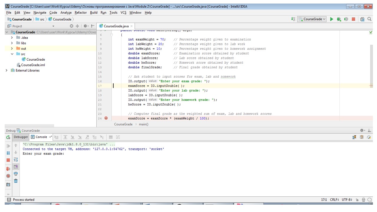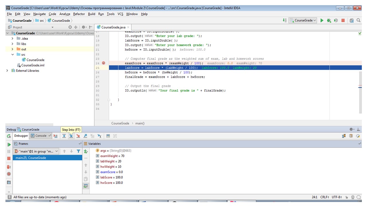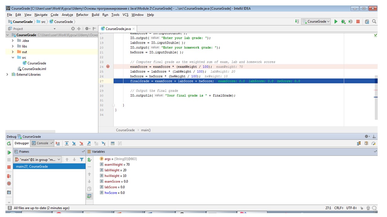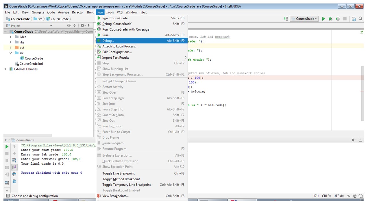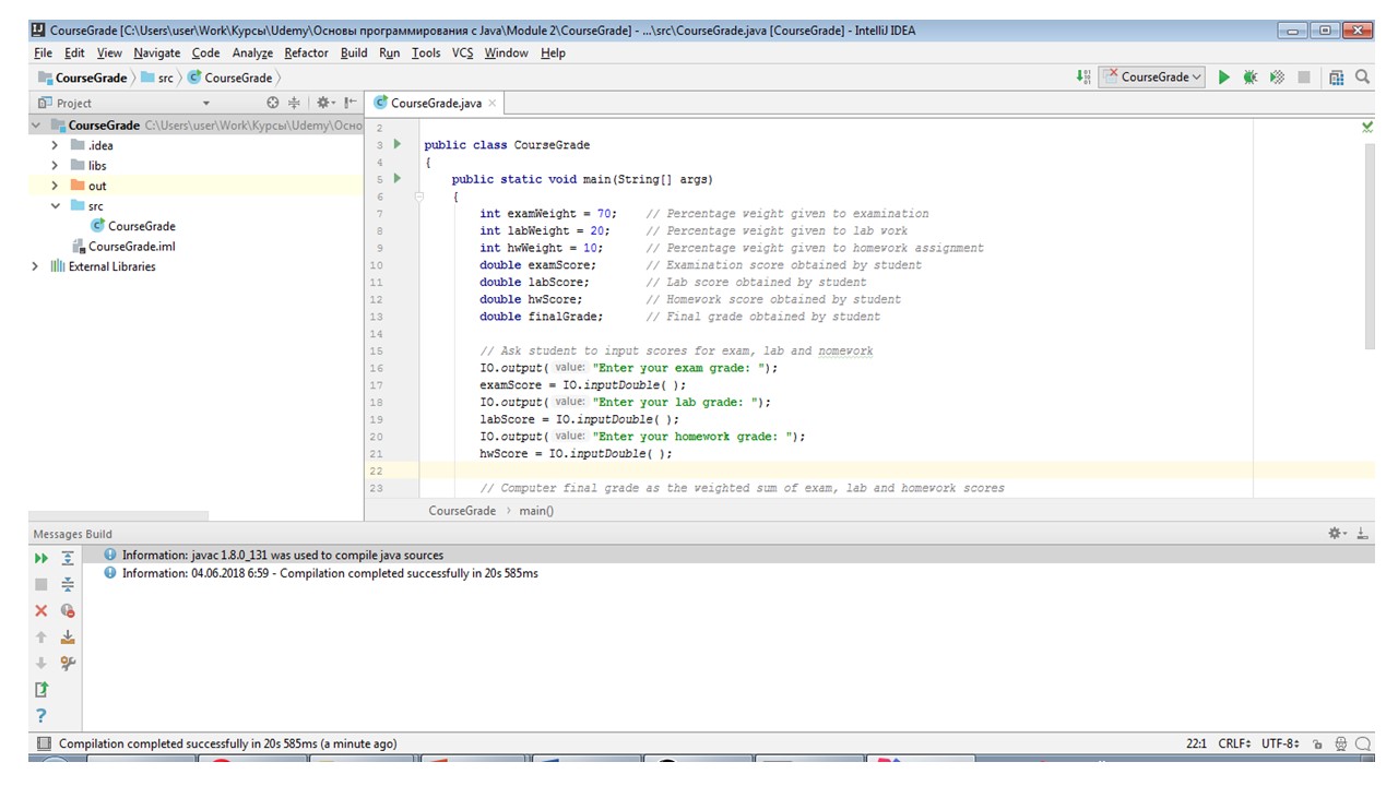 Давайте теперь посмотрим на программу в среде IntelliJ IDEA. Мы откроем проект под названием CourseGrade, который является программой, которую мы только что обсуждали.