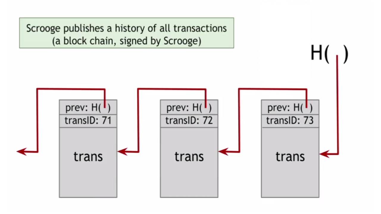 Если Scrooge попытается добавить или удалить транзакцию в истории, или изменить существующую транзакцию, это затронет все следующие блоки из-за хэш указателей.