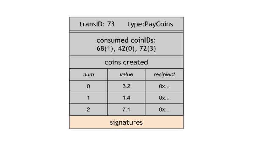 Например, чтобы разделить монету, Алиса может создать новую транзакцию, которая потребляет эту одну монету, а затем создает две новые монеты той же общей стоимостью.