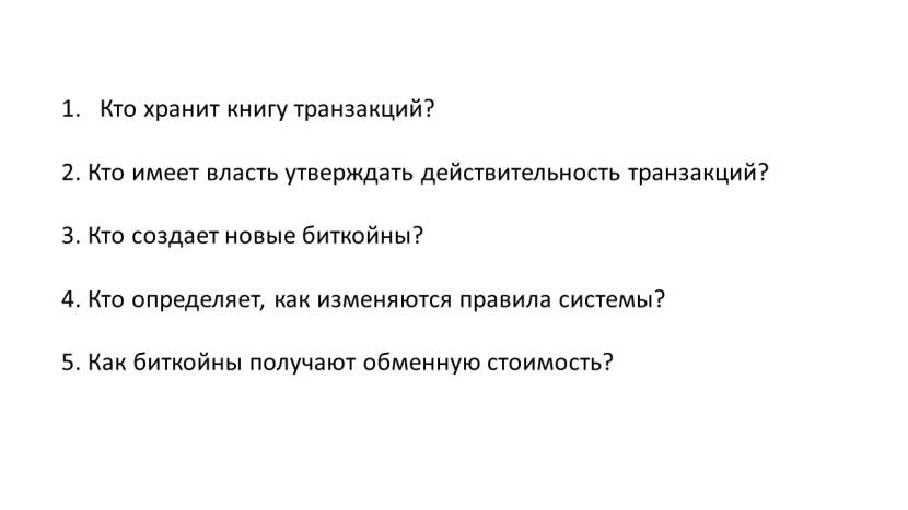 Имея это в виду, давайте разделим вопрос о том, как протокол Bitcoin достигает децентрализации на пять более конкретных вопросов: