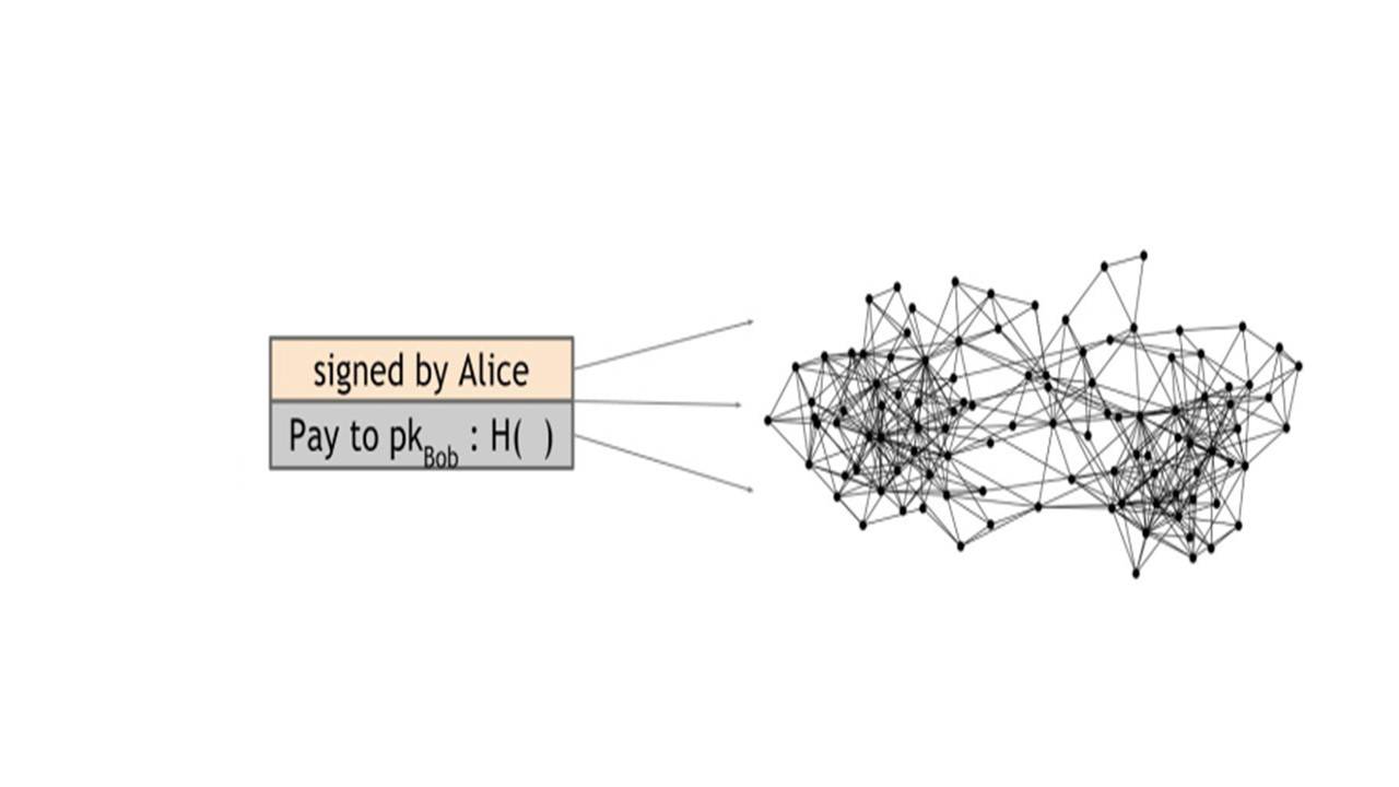 Когда Алиса хочет заплатить Бобу, то, что она на самом деле делает, это транслирует транзакцию на все узлы Bitcoin, которые составляют одноранговую сеть.