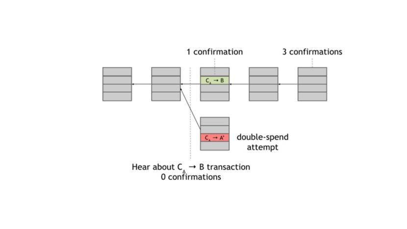 Затем узел, который выбирает следующий блок, может решить использовать один из этих блоков, и этот выбор определяет, удастся ли выполнить двойную трату.