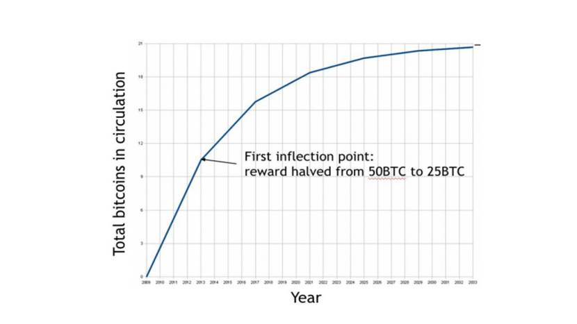 Bitcoin построен таким образом, чтобы увеличивать количество средств в логарифмической прогрессии пока не будет достигнута цифра в 21 млн. биткойнов.