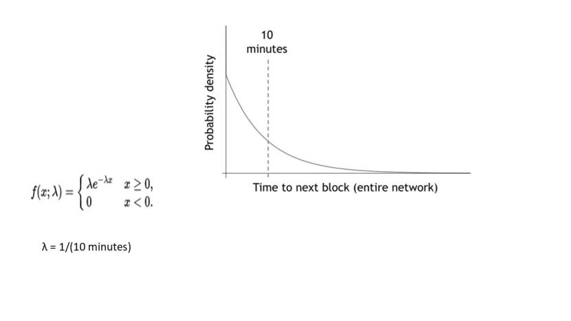 Как правило, узлы пробуют так много nonce, что испытания Бернулли, являющиеся дискретным вероятностным процессом, могут быть хорошо аппроксимированы непрерывным вероятностным процессом, называемым пуассоновским процессом, процессом, в котором события происходят независимо с постоянной средней скоростью.