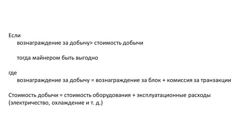 при этом, стоимость добычи = стоимость оборудования + эксплуатационные расходы (электричество, охлаждение и т. д.)