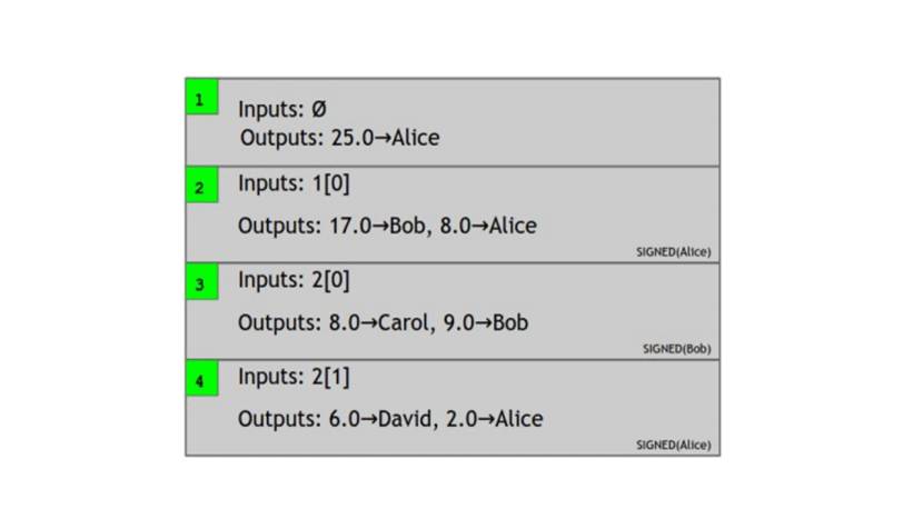 В этом примере, после того как Алиса получила 25 монет в первой транзакции, затем передает 17 монет Бобу во второй транзакции, и у нее осталось еще 8 биткойнов на ее счете.