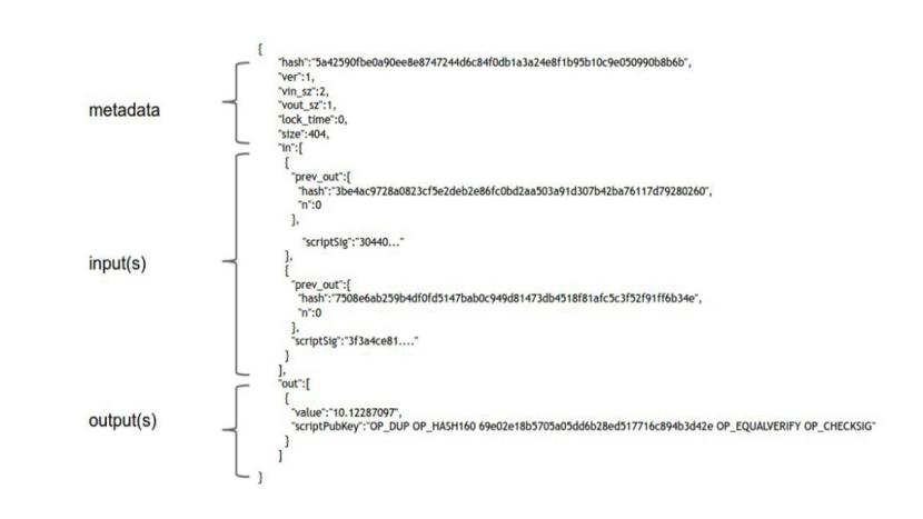 Что качается метаданных, здесь есть некоторая информация о самой транзакции – размер транзакции, количество входов и количества выходов.