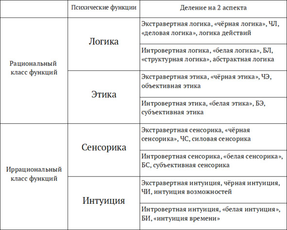 Аспекты получаются при соотнесении этих характеристик с дихотомиями. Так, логика и этика относятся к рациональному классу функций, а сенсорика и интуиция – к иррациональному. Далее эти функции делятся ещё на экстравертные и интровертные. Так мы получаем 8 аспектов.