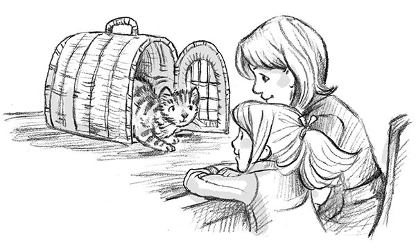 Ева открыла корзинку, а Хейди вытащила оттуда испуганного полосатого кота с яркими жёлтыми глазами.
