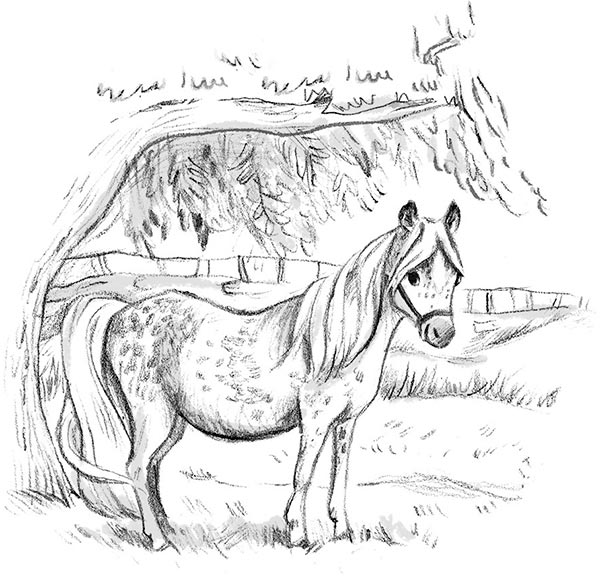 Ева от удивления открыла рот. Из-за деревьев вышла красивая, серая в пятнышках, пони. Грива и хвост лошадки были белоснежными. Пони поскакала по склону холму, направляясь к людям.