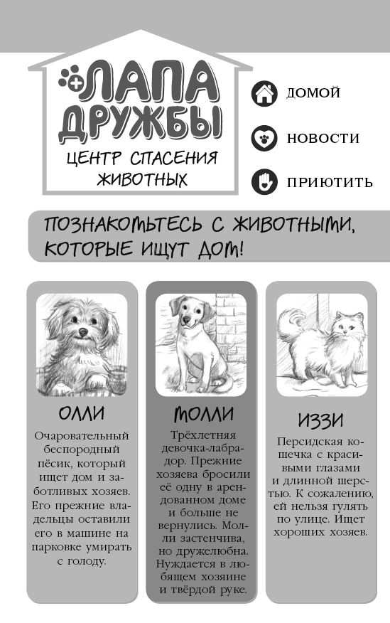 Центр спасения животных открылся год назад. Хейди работала ветеринаром, и именно ей пришла в голову идея помогать бездомным собакам и кошкам, а также другим животным, которых бросили хозяева. Вместе с Марком они нашли старую ферму на окраине Окхема и превратили её в приют. Потребовалось много работы, но зато теперь у них были отдел для кошек, отдел для собак и небольшая пристройка, в которой они держали мелких животных вроде хомяков и кроликов. Старую маслодельню перестроили в клинику, где Хейди делала прививки новым постояльцам, стерилизовала и ставила чипы, чтобы, если животное сбежит, любой нашедший и принёсший его в ветклинику мог узнать, откуда оно.