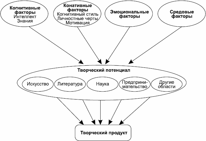 Согласно многофакторному подходу, который будет описан в разных главах данной книги, креативность зависит от когнитивных, конативных, эмоциональных и средовых факторов. Каждому человеку свойственно особое сочетание этих факторов. Это сочетание может в большей степени соответствовать требованиям задач из некоторой определенной области человеческой деятельности. Таким образом, творческий потенциал человека в разных областях деятельности является результатом взаимодействия этих факторов. Творческий потенциал часто проявляется в продуктах, порождаемых человеком. Степень креативности этих продуктов оценивается с учетом социального контекста.