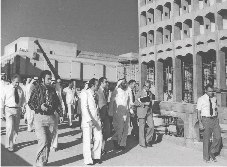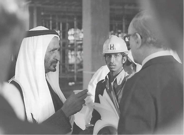 Эксперты и советники сопровождают шейха Рашида бин Саида аль-Мактума (на фото в центре) во время визита на стройплощадку Всемирного торгового центра в Дубае. Около 1978 г.