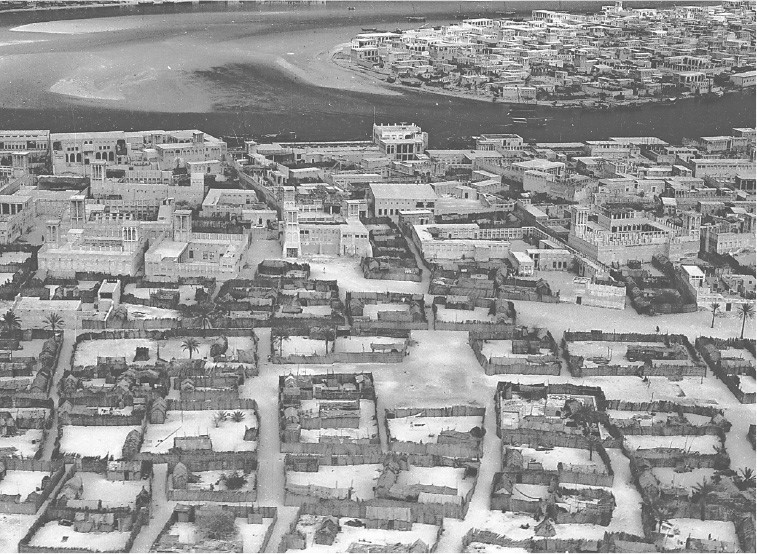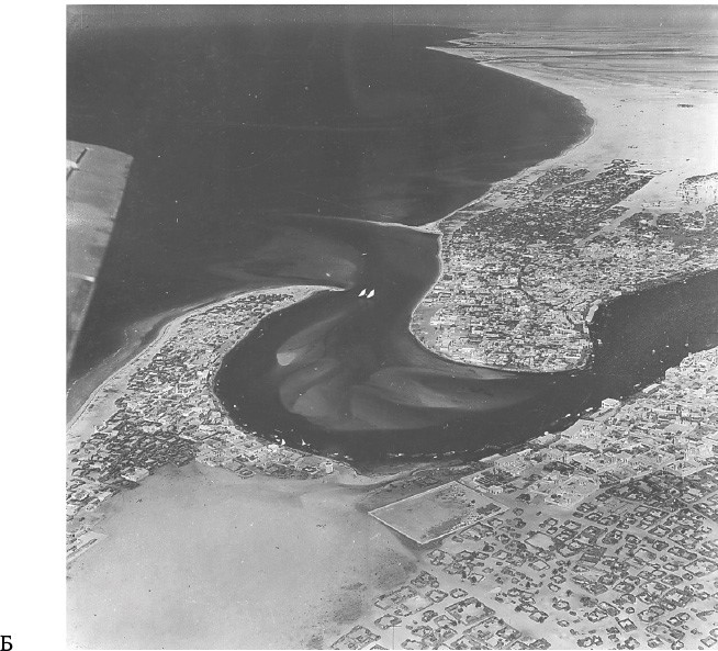 Вид с воздуха на Бур-Дубай – примерно в то время, когда британское правительство установило, что в порту Дубая было «больше перспектив», чем где-либо еще в Договорном Омане. Вокруг изгиба водного пути находятся печально известные песчаные отмели, опасные для грузовых судов.