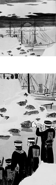 Внезапно рядом с креслами дам грянула веселая, бодрая музыка военно-морского оркестра. В тот же момент двери напротив эстрады распахнулись и в зал, точно стайка бабочек, пляшущих в весеннем ветерке над пестрым ковром цветов, впорхнули два десятка молоденьких девиц со шляпами в руках.
