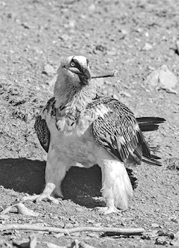 Бородач берет с собой высоко в небо кости и сбрасывает их на обнаженные скалы, чтобы разбить вдребезги. Затем он съедает кусочки.