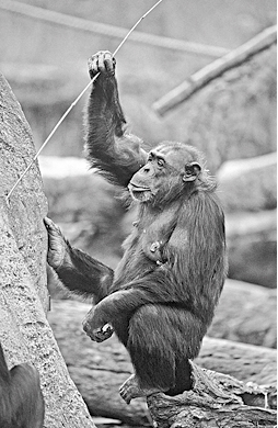 Шимпанзе ловит термитов «удочкой», сделанной из травяных стеблей.