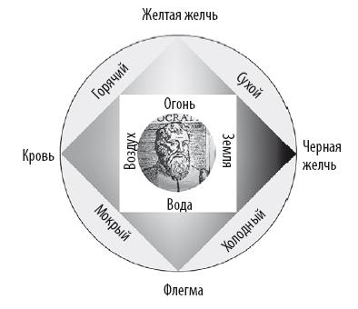 Простые элементыВместо этого он искал физическую причину плохого здоровья и разработал гуморальную теорию, объяснявшую физические и психические заболевания. Греческие ученые полагали, что мир, в том числе и человеческое тело, состоит из основных веществ, позже ставших известными как элементы. Элементов было всего четыре: земля, воздух, огонь и вода. Они присутствовали в организме в виде жидких гуморов: кровь, мокрота, желтая и черная желчь. Каждый из таких гуморов разделял характеристики своего элемента и оказывал влияние на эмоции. Заполненная воздухом кровь порождала сангвинический оптимизм. Водянистая мокрота придавала флегматичное спокойствие. Слишком большое количество земляной черной желчи подавляло людей и вызывало меланхолию, в то время как желтая желчь разжигала огненную ярость. В здоровом теле и разуме эти элементы смешаны в равных пропорциях, но если один из них начнет доминировать над другими, то человек заболеет. Психические и физические расстройства лечились точно таким же образом – путем восстановления баланса гуморов.
