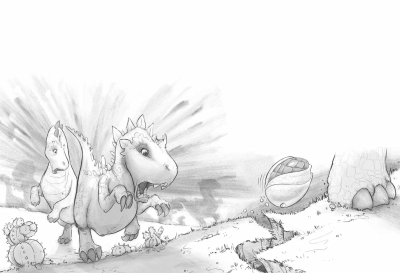 Яйцо приземлилось на груду листьев и не разбилось, а покатилось под ноги бегущим ящерам. Те пинали его туда-сюда, но оно даже не треснуло! Мамазавр и Паплодок пытались поймать яйцо, катавшееся между гигантскими лапами диплодока и слоновьими копытами стегозавра. Их самих пару раз чуть не задавили. А яйцо всё катилось и катилось, как будто у него была какая-то цель; оно падало со скалистых уступов на кроны деревьев, скользило вниз вместе с глинистыми оползнями, а Мамазавр и Паплодок безуспешно пытались его догнать.
