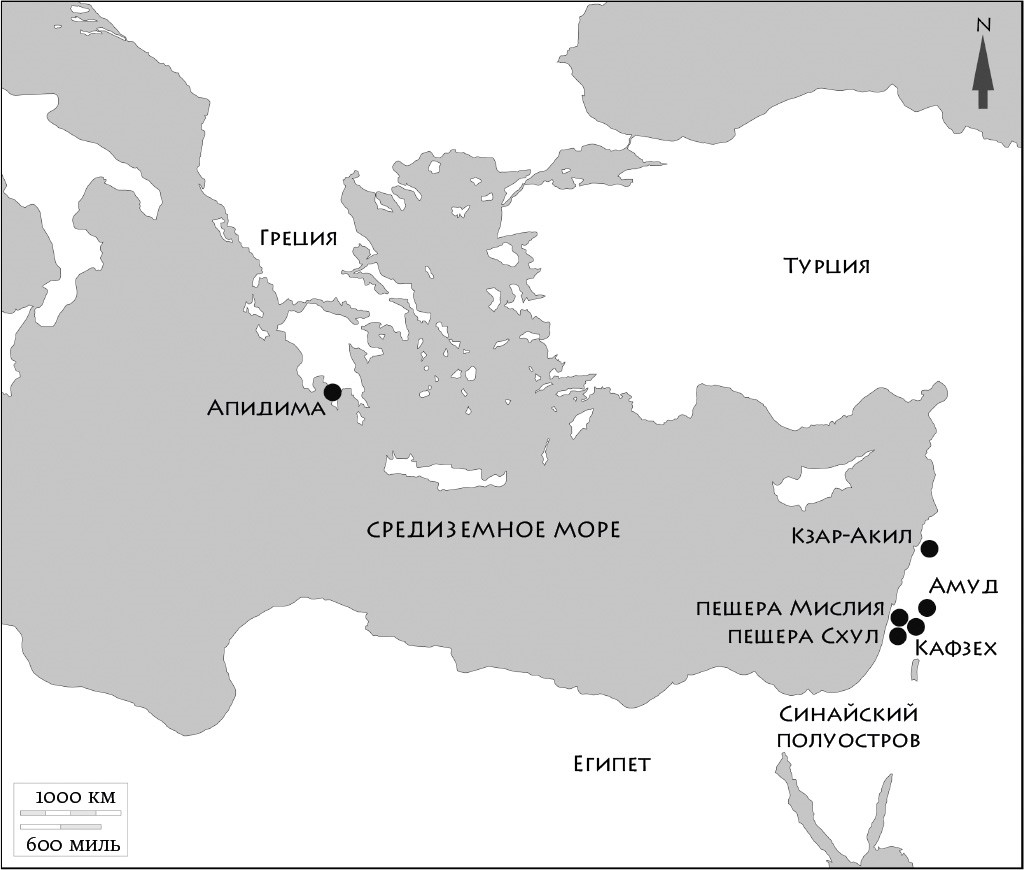 Похоже, что исход «современных» людей из Африки совершался по двум маршрутам. Первый проходил через Синайский полуостров. Преодолев Синай, можно за несколько дней пешком добраться до Леванта – области, охватывающей современные Палестину, Ливан, Иорданию, Сирию и Израиль. Хотя Левант и считается частью Азии, с точки зрения биогеографии он является продолжением северной Африки. Не следует забывать, что еще относительно недавно эти места воспринимали как прародину для очень многих африканских и арабо-африканских животных. Исследовательский проект, в котором я принимал участие, выявил в израильских пещерах свидетельства обитания гиены, леопарда, льва, верблюда, зебры и газели. Так что, пожалуй, нет ничего удивительного в том, что в этом регионе мы находим следы жизни древнейших «современных» людей: если за пределы региона могли переселяться животные, то и людям это было под силу. Я часто отмечал, что хорошим индикатором обитания людей в некоем месте является присутствие в этом месте добычи; люди склонны селиться там, где можно добыть дичь, – либо выслеживая ее, либо устраивая засады на звериных тропах.
