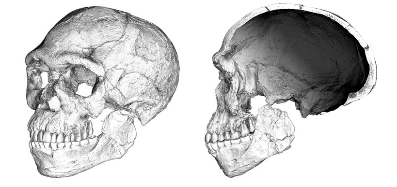 Рис. 3. Наш первопредок. Древнейшие на сегодня окаменевшие останки представителя вида Homo sapiens из поселения в Джебель-Ирхуде. Изображения составлены из микросрезов компьютерных томограмм нескольких найденных окаменелостей. Строение лица выглядит современным и укладывается в диапазон вариаций, которые можно увидеть сейчас, однако имеющиеся архаичные особенности в форме черепной коробки (затенена на рисунке справа) позволяют понять, что форма мозга еще не та, что у человека наших дней