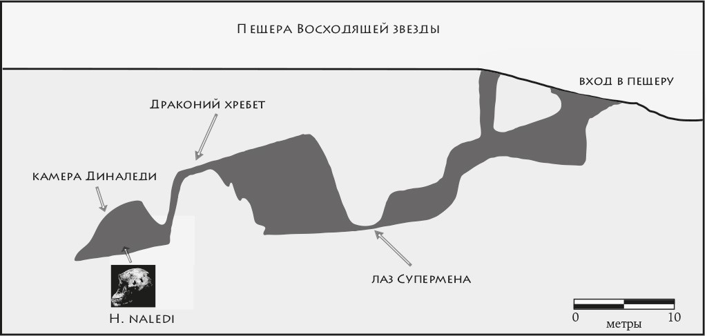 Рис. 4. Схема пещеры Восходящей звезды с обозначением места, где были найдены скелетные останки Homo naledi