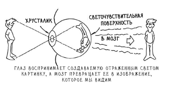 Камера похожа на человеческий глаз, но не является идеальной его имитацией. Подобно глазу, она видит благодаря линзе, собирающей лучи света, отраженные от снимаемых объектов. Для глаза такой «линзой» является хрусталик, для камеры – объектив. Линза направляет свет на поверхность, где распознается картинка, создаваемая благодаря тому, что разные части сцены отличаются по яркости и цвету. В случае с глазом данная поверхность в глубине глаза отправляет полученную световую картинку в мозг, где она и превращается в то изображение, которое мы «видим».