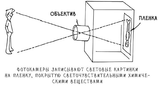 В случае с камерой объектив направляет световую картинку на несколько чувствительных поверхностей. Фотокамеры записывают световые картинки на пленку, покрытую светочувствительными химическими веществами. Реакция этих веществ бывает разной и зависит от количества света и его цвета, благодаря чему на основе световой картинки и создается запись либо изображение. После обработки пленки другими химикатами получившееся изображение становится видимым.