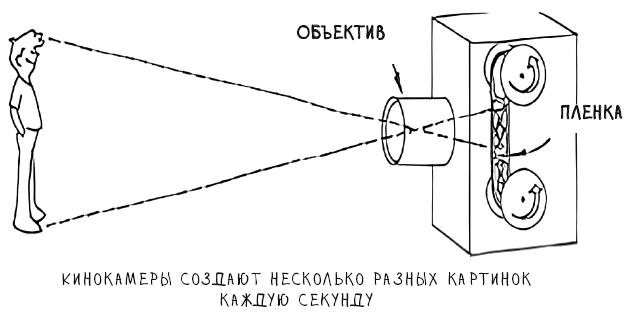 Кинокамеры записывают изображения так же, как фотокамеры, только делают это гораздо чаще. Камеры с 8-миллиметровой пленкой обычно снимают восемнадцать разных картинок – кадров – в секунду. Камеры с 16-миллиметровой и 35-миллиметровой пленкой снимают по 24 кадра в секунду. Когда эти картинки проецируются на экран в том же темпе, они создают иллюзию непрерывного движения. Мозг зрителя заполняет пробелы между отдельными кадрами благодаря особенности физиологии человека, известной как инерция зрительного восприятия.