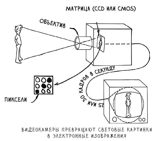 В цифровых камерах, будь то фото или видео, объектив фокусирует световые картинки на светочувствительной матрице – либо CCD-матрице (прибор с зарядовой связью'), либо CMOS-матрице (комплементарная структура металл – оксид – полупроводник)[5]. На поверхности матрицы находится от нескольких тысяч до нескольких миллионов крошечных светочувствительных зон, именуемых элементами изображения, или пикселями, которые меняются в зависимости от цвета и насыщенности поступающего на них света. В видеокамерах изображение, создаваемое благодаря объединению всех пикселей, электронным образом считывается с матрицы со скоростью 25 или 30 полных изображений в секунду. Затем эти изображения записываются или транслируются (см. рисунок на следующей странице).