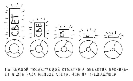 Отметки шкалы диафрагмы организованы таким образом, что можно дойти от f/1 до f/22 и дальше, причем на каждой последующей отметке в объектив будет проникать в два раза меньше света, чем на предыдущей. Последовательность такова: f/1, f/1.4, f/2, f/2.8, f/4, f/5.6, f/8, f/11, f/16, f/22, f/32, f/45, f/64 и так далее. На отметке f/1.4 в объектив поступает в два раза меньше света, чем на отметке f/1. На отметке f/4 света поступает в два раза меньше, чем на отметке f/2.8.
