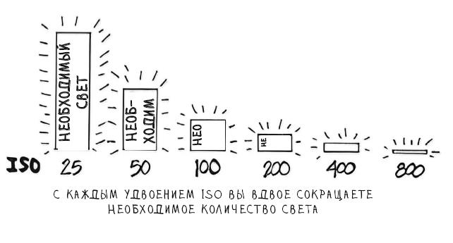Показатели ISO увеличиваются в геометрической прогрессии в том, что касается чувствительности пленки. С каждым удвоением показателя ISO вы вдвое сокращаете количество света, необходимое для получения пригодного к употреблению изображения.