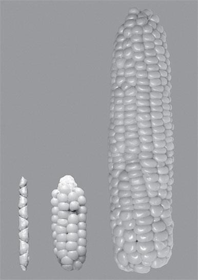 Початки, находившиеся ближе к земле, были ближе и к питательным веществам и потенциально могли вырасти намного больше. Еще раз. Этим процессом руководил человек. Протофермеры отдавали предпочтение растениям с большими початками, а ядра из этих початков использовали затем для посева. Таким образом, следы мутации, которые приводили к увеличению початков, наблюдались и в следующих поколениях кукурузы. Это подтверждают данные археологов. В одной пещере в Мексике была найдена связка початков, каждый из которых был больше предыдущего от полдюйма до восьми дюймов. Подтвердилось также и то, что кукуруза, привлекательная для людей, оказалась менее жизнеспособной в дикой природе. Растение с большим початком не может самостоятельно размножаться.