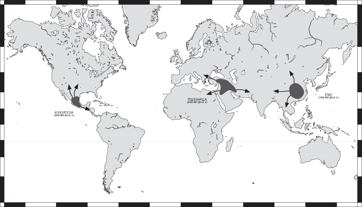 В сравнении с животными, многие из которых собирают и хранят семена и другие продукты питания, люди маниакальны в намеренном выращивании определенных культур, выборе и распространении их определенных характеристик. Как и ткачиха, плотник или кузнец, фермер создает полезные вещи, которые не встречаются в природе, причем делает он это с использованием модифицированных растений и животных. При этом любые свои творения он делает в гораздо больших количествах, чем если бы они существовали в естественных природных условиях. Значение полученных результатов переоценить невозможно, потому что именно они позволили создать современный мир. В частности, три одомашненных растения – пшеница, рис и кукуруза – оказались наиболее значимыми в организации жизни человека. Именно они стали основой развития цивилизации и по сей день не утратили своей актуальности.