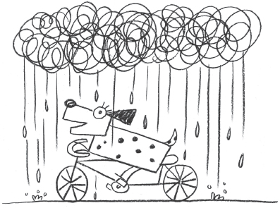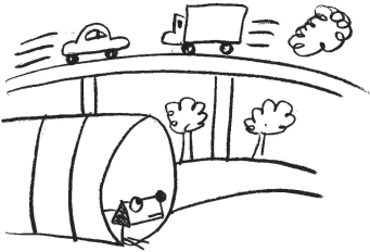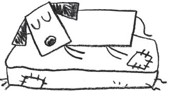 There’s no water in Stick Dog’s pipe. It’s nice and dry. And Stick Dog has decorated it with some of his favourite things. He sleeps on a comfy old couch cushion. He found it by a Dumpster behind a furniture store and dragged it home at night when nobody was watching. Stick Dog finds a lot of things this way.