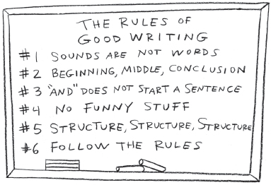 He likes to stand in front of class and say “Good writers follow good rules.” He has lots of rules when it comes to writing. There have to be introductions and conclusions to everything, for instance. Sentences need to have proper structure. He says telling funny stories is for the campfire, not the classroom. He says starting sentences with the word “And” is unacceptable. He says never use sounds for words.