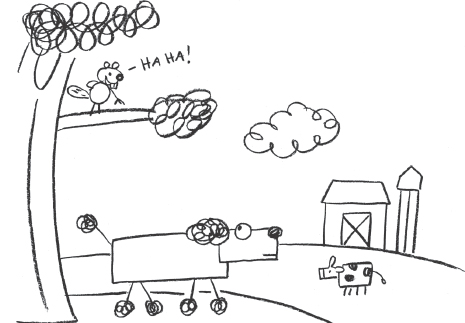 “Okay, okay. They’re evil,” said Stick Dog. “I just wonder why we have to worry about this particular squirrel in this particular tree at this particular time. We’re on our way to find tasty hamburgers. With a good strategy and some good teamwork, we could be feasting on hamburgers in no time.”