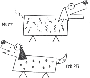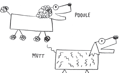 There’s also a mutt. Now, I couldn’t figure out how to draw a mutt, which is a dog made up of many different breeds of dogs all mixed together. So he’s that wavy dude up there. Because, really, a mutt can be just about anything, right? Big, small, long fur, short fur, curly – whatever. So wavy lines in the fur mean mutt. Got it?