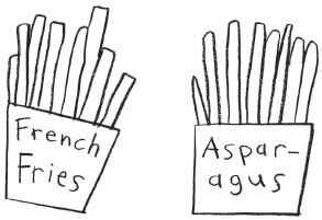 First, you should know that it’s not just dogs that I can’t draw very well. I pretty much can’t draw anything very well. I can’t draw flowers, houses, candy bars, asparagus, donkeys, caterpillars, aeroplanes, elbows, or French fries very well either. In fact, my asparagus stalks look a lot like my French fries. You should get the idea just from this example.