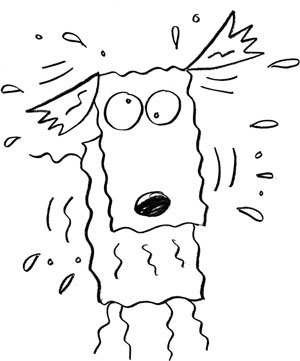 And then Mutt began to shake. He started slowly at first, spraying the others with big droplets of water from his shaggy fur. But then his shaking sped up, until he trembled and vibrated so hard the dry dirt around his paws puffed up in little brown clouds. With this vigorous shaking, Mutt was able to spray his companions not with big droplets of creek water but with a fine, cooling mist.