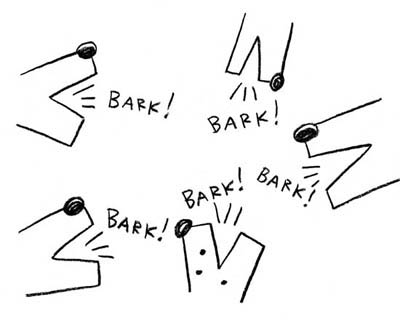 The game the five dogs were playing is called BARK! And the game goes like this: Whenever something moves anywhere – a leaf in the wind, a bird flying by, a triceratops charging out of the forest – the first one to bark gets five points. The second one to bark gets four points, the third barker gets three points, and so on. Whoever has the most points at the end of the game is the winner.