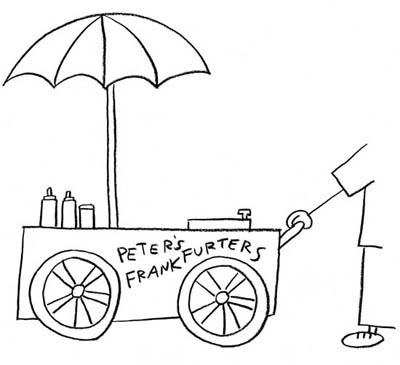 Now, Stick Dog didn’t know for sure that the man’s name was Peter. But the side of his cart said “Peter’s Frankfurters.” So he just assumed that the man pushing the cart was named Peter. The cart was white, with printing on the side. There was an umbrella over the top of it. And it had four big wheels. Peter was pushing it and ringing an attached bell.