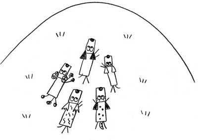 On this day, Stick Dog and his buddies were all at his home playing a game. Stick Dog lives in a big pipe out in the woods and sleeps on an old couch cushion. The pipe is nice and dry, and the couch cushion is nice and cushy.