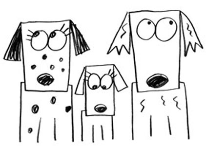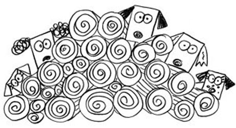 Mutt, Poo-Poo, Karen, and Stripes followed Stick Dog along the edge of the woods. They snuck behind sticker bushes, cattail reeds, and tall, thick weeds. Soon they were staring out from behind a neatly stacked pile of logs.